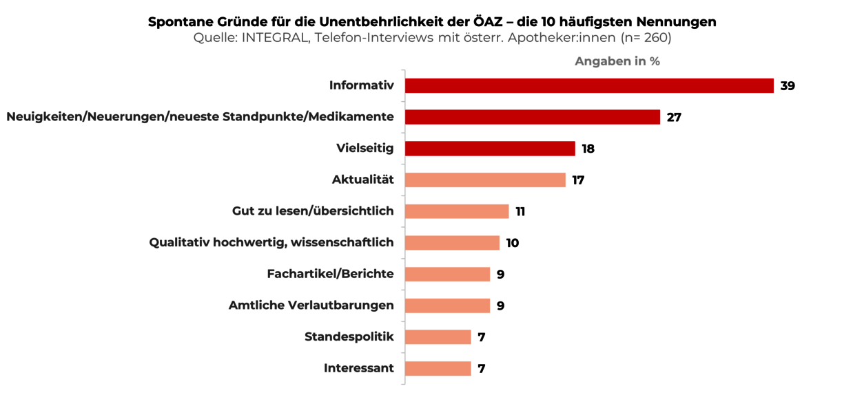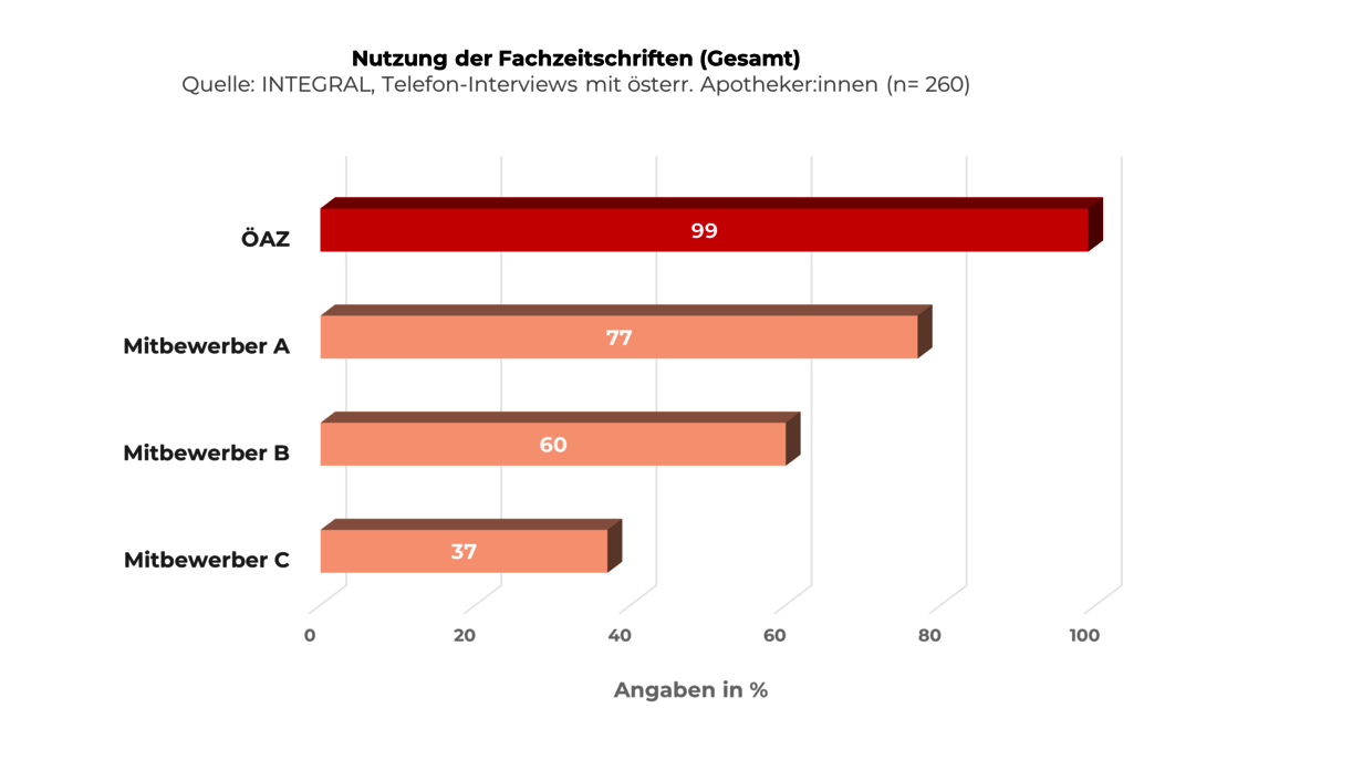 Mit einer Gesamtreichweite von 99 Prozent bleibt die ÖAZ die mit Abstand führende Fachzeitschrift der Branche. Drei Viertel der Befragten haben die ÖAZ in den letzten zwei Wochen gelesen, 60 Prozent greifen zu jeder Ausgabe. Bei den entscheidenden Qualitätsmerkmalen – Seriosität, Kompetenz und Wissensvermittlung – liegt die ÖAZ mit deutlichem Vorsprung an der Spitze.