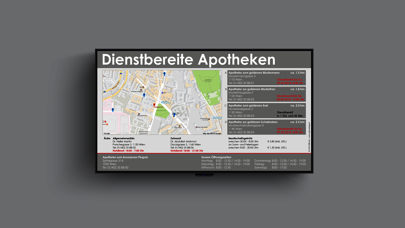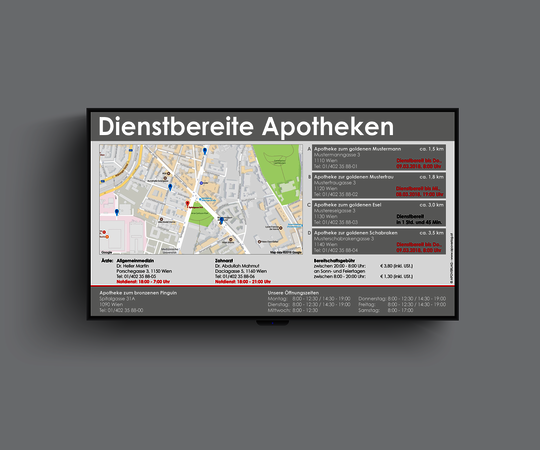 Aktuelle Bereitschaftsdienste visuell ansprechend am Point of Sale oder in Ihrer Auslage anzeigen – wartungsfrei, vollautomatisch und tagesaktuell.