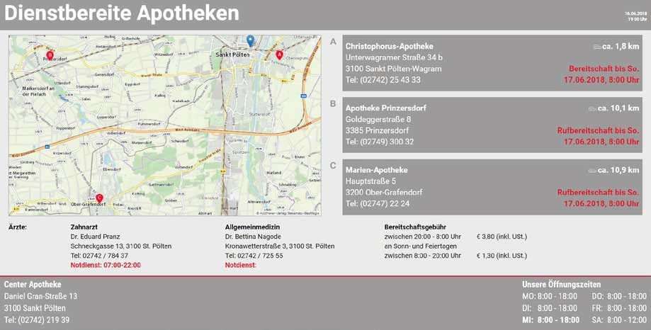 Die Bereitschaftsdienstanzeige (BA) wird vollautomatisch mit aktuellen, amtlichen Bereitschaftsdienstdaten – gespeist von der Apothekerkammer – befüllt, die auch auf einer übersichtlichen Karte angezeigt werden. Aufgelistet werden außerdem die nächstliegenden diensthabenden Apotheken inkl. Adresse, Entfernung und Öffnungszeiten.