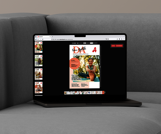 Noch mehr Reichweite gefällig? Mit unserem Online-Content-Service bieten Sie Ihren Kund:innen die aktuelle „DA" als E-Paper direkt auf Ihrer Apotheken-Homepage an – ohne Mehraufwand für Sie. Und mit einem individuellen Firmeneindruck wird die DA zu Ihrem persönlichen Aushängeschild: Ihr Logo, Ihre Kontaktdaten – auf jedem Exemplar.