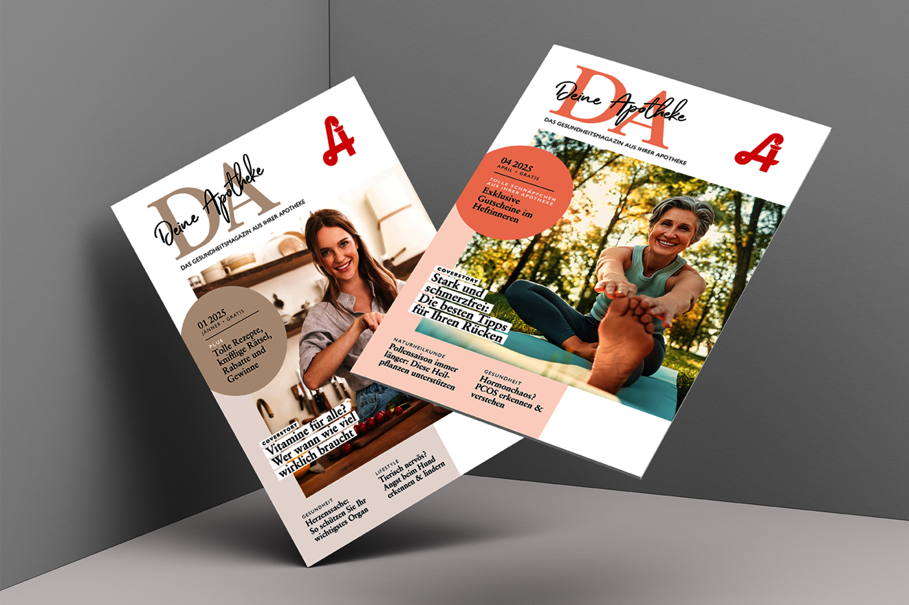 Stärken Sie die Kundenbindung in Ihrer Apotheke – mit einem der reichweitenstärksten Apothekenmagazine Österreichs. Die „DA – Deine Apotheke" erreicht monatlich knapp 68.000 Leser:innen in nahezu 850 Apotheken österreichweit. Verständliche Gesundheitsinhalte und monatliche Couponing-Aktionen begeistern Ihre Kund:innen – Monat für Monat. Kostenlos für Ihre Kund:innen, wertvoll für Ihre Apotheke.