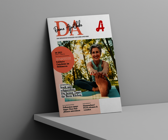 Das Apothekenmagazin „DA – Deine Apotheke" liefert Ihren Kund:innen verlässliche, vielfältige und informative Beiträge und Tipps rund um körperliche und mentale Gesundheit, Naturheilkunde, Kosmetik, Sport, Haustiergesundheit und Laborwerte. Seit mehr als 75 Jahren begleitet die DA gesundheitsbewusste Menschen in Österreich.