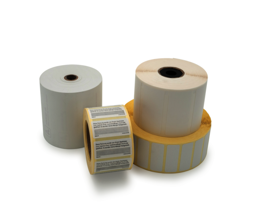 Thermo-Bonrollen sowie Etiketten in verschiedenen Formaten für eine saubere und gut lesbare Beschriftung.