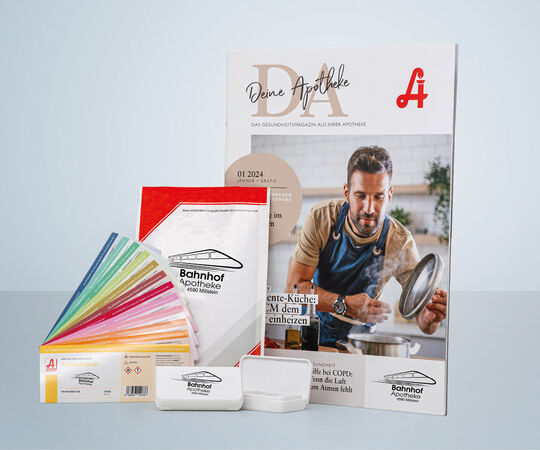 Artikel für die Apotheke mit individuellem Firmenlogo oder Aufdruck. Verpackungen, Tragetaschen und Etiketten für einheitlichen Markenauftritt im Alltag.