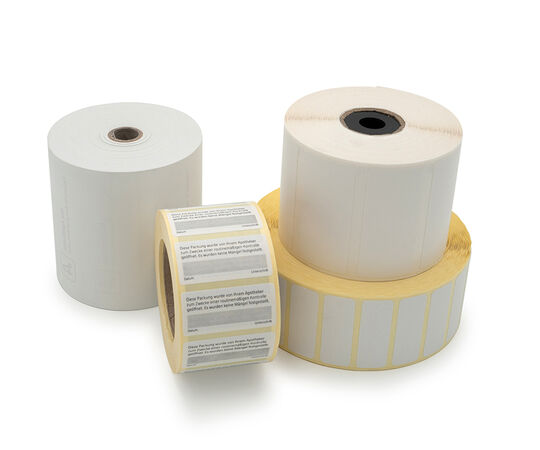 Thermo-Bonrollen sowie Etiketten in verschiedenen Formaten für eine saubere und gut lesbare Beschriftung.